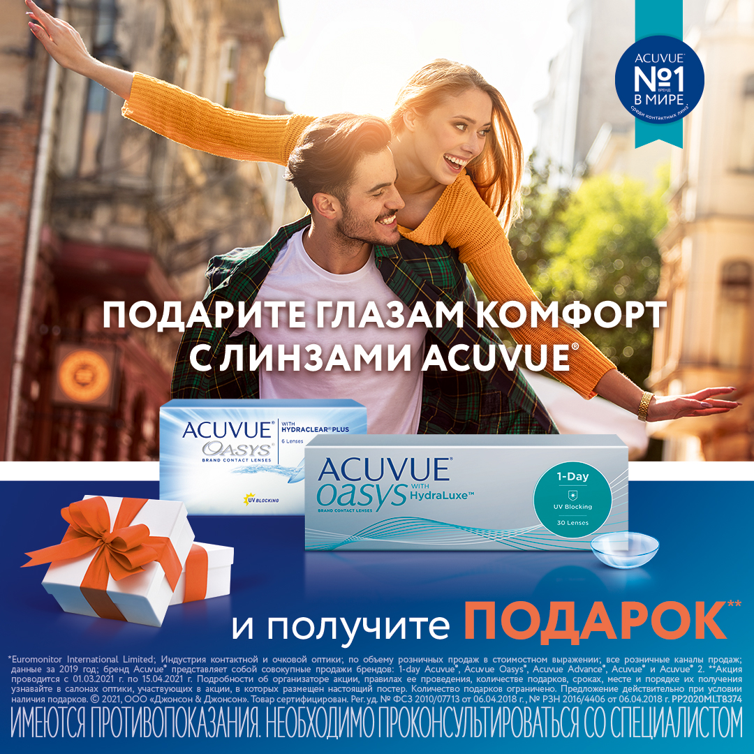 При покупке двух упаковок контактных линз Acuvue Oasys for astigmatism в подарок мультикарта на 300 рублей или ACUVUE OASYS 1DAY for ASTIGMATIS Вы получаете мультикарту на 500 рублей В ПОДАРОК!